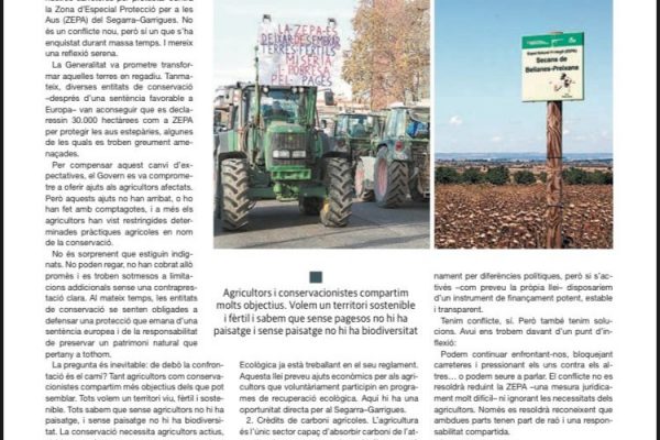 Avui el nostre president, Manuel Raventós, ha publicat una columna d’opinió al diari Segre i ahir al diari La Mañana, titulada “Diàleg per resoldre el futur de la ZEPA”, on analitza el conflicte recent entorn de les Zones d’Especial Protecció per a les Aus (ZEPA) al Segarra–Garrigues i proposa com afrontar-lo des d’una perspectiva deContinua llegint ““Diàleg per resoldre el futur de la ZEPA Segarra-Garrigues”“